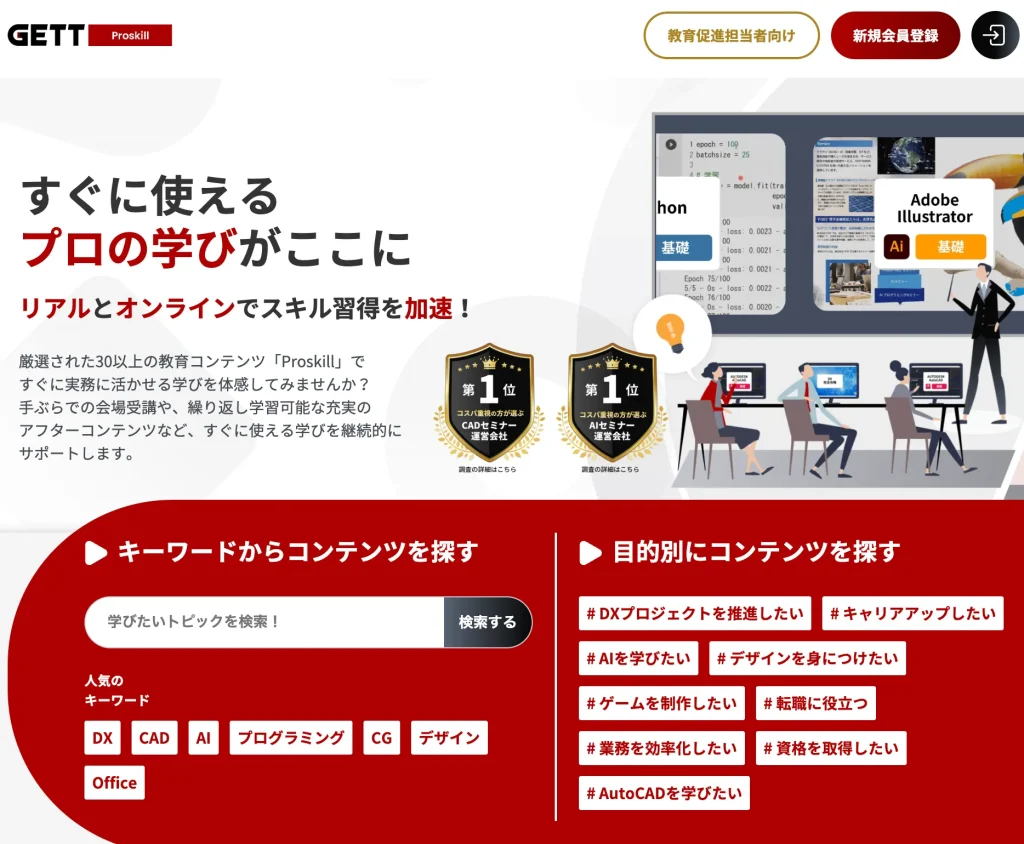 AI人材育成のGETT Proskill(ゲットプロスキル)が提供する「生成AIセミナー」は短期集中講座です。未経験者でも2日間で生成AIの基礎から高度な応用まで学べる実践的な内容が魅力です。