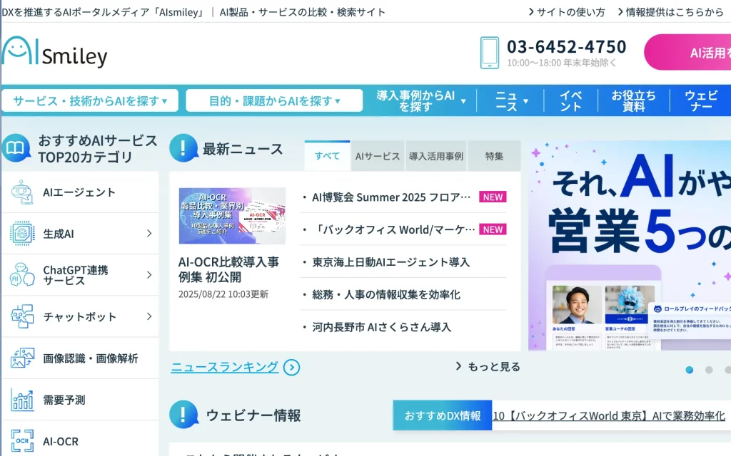 「AIsmiley」は、AIサービス情報プラットフォームのAIsmileyが主催する無料オンラインセミナーです。業界ごとのAI活用事例や最新サービスの紹介など、実務に直結するテーマのウェビナーを数多く開催しています。
