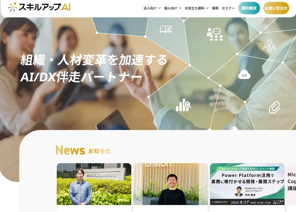 「スキルアップAI」は、AI人材育成を行うスキルアップAI社が提供するセミナーシリーズです。基本は無料ウェビナー形式で、企業でのAI導入をテーマにした専門性の高い講座を展開しています(一部有料セミナーもあり)。