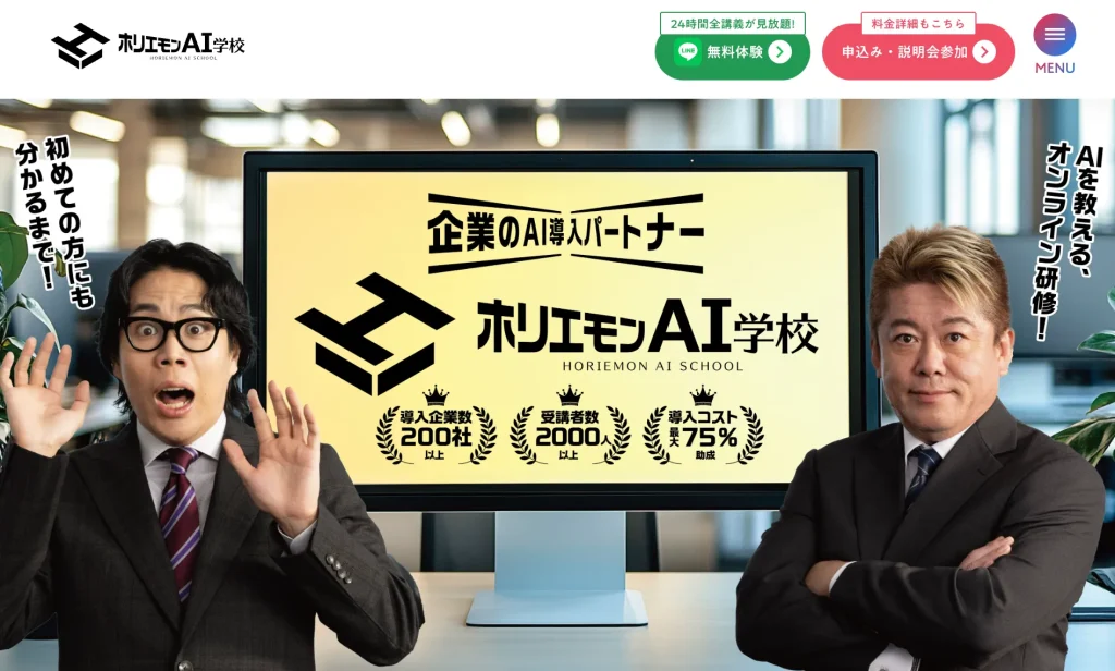 | ホリエモンAI学校 | ホリエモンAI学校株式会社 | 個人:16,280円 法人:約31万 | 24時間 月単位で継続・設定可能 | ChatGPTなど生成AIの基礎から、Pythonプログラミング、画像生成 | 初心者〜中級者 |